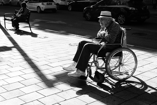 Эту сценку мне довелось снять на улицах Тель Авива: старичку-инвалиду захотелось погреться в одиночестве на солнышке и он отослал сиделку на скамейку, метров в 10 от него.... только тень от столба связывала их...