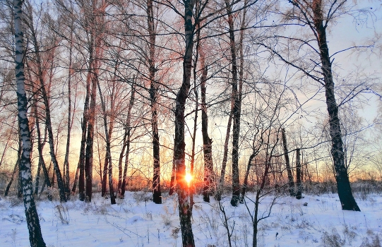 Зимой на закате в берёзовой роще