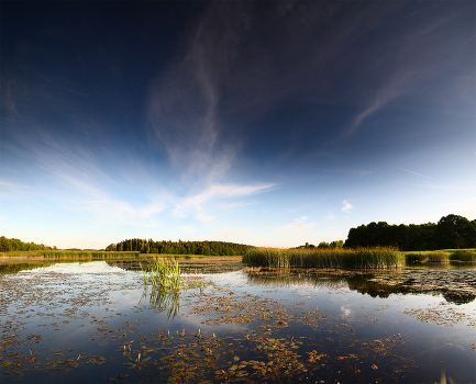 середина лета, вечерний штиль на заросшем озере, прогулка на лодке