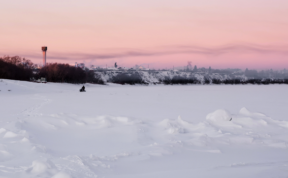 Берег Иртыша, село, утро, восход солнца.. рассеивается лёгкий туман, а чёрная дымка из печных труб растянулась вдоль реки.. Рыбаки едут на интересном транспорте на рыбалку..