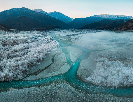 Зимний пейзаж на фоне Кавказского хребта. Рассветное солнце только-только освещает вершины гор. Изумрудная лента реки сквозь туман. И белый иней на деревьях.