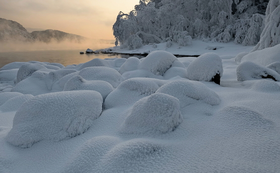 Камни , покрытые снегом и изморозью, напоминают лежбище морских котиков.