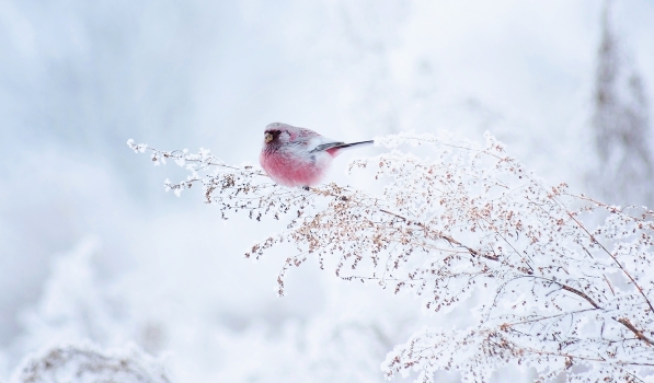 Занимается зимней прополкой сорняков. И главное – морозов не боится. Такой серебристо-розовый комочек, весом 12-15 грамм, и совсем не мерзнет. Даже на ветру.