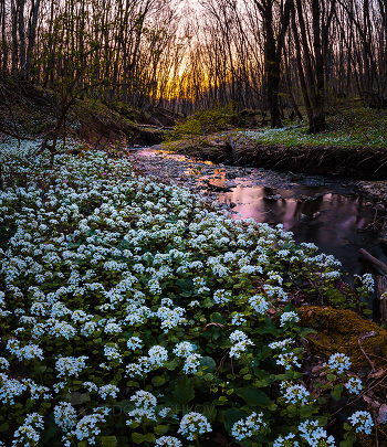 Весенний закат в апрельском лесу около города Ставрополь. Цветёт толстостенка крупнолистная - Pachyphragma macrophyllum (Hoffm.) N. Bush. Из фотопроекта «Открывая Ставрополье».
