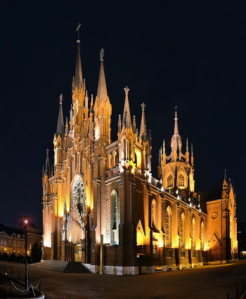 Католический собор Непорочного зачатия Пресвятой Девы Марии на Малой Грузинской. Cчитается, что прообразом фасада послужил готический собор в Вестминстере, а прообразом купола явился купол кафедрального собора в Милане. Основной объём храма был построен в 1901—1911 годах в стиле неоготики