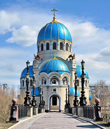 Храм выстроен в византийском стиле напоминающем нам, что православная вера пришла к нам через Византию, об этом же, наверное, говорят и двуглавые золотые орлы.