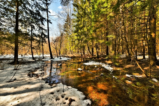 "Глянуло солнце в лесные трущобы - И разбежались с ворчаньем сугробы, Только в ложбинах, в глубокой тени, Снежные клочья остались одни ..." Е.Трутнева