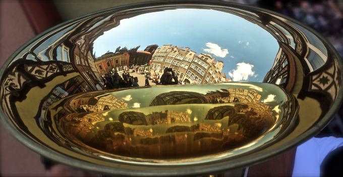 Отражение в трубе духового оркестра на городской площади. Гданьск, Польша.