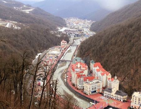 Красная поляна в Ахтырском ущелье и протекающая река Мзымта