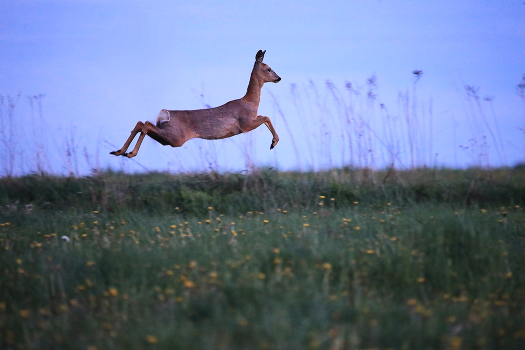 Самка косули резвится в поле за деревней. Полный кадр. Смог тихо подойти по руслу мелиоративного канала и остаться не замеченным.