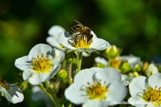 Пчела в белом цветке земляники