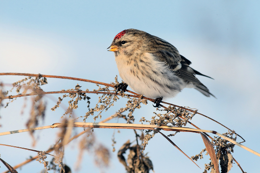 морозный январский день, штиль, стая чечёток кормится