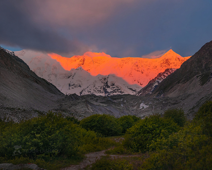 Первые лучи солнца, окрасили белоснежный хребет в розово-оранжевый.