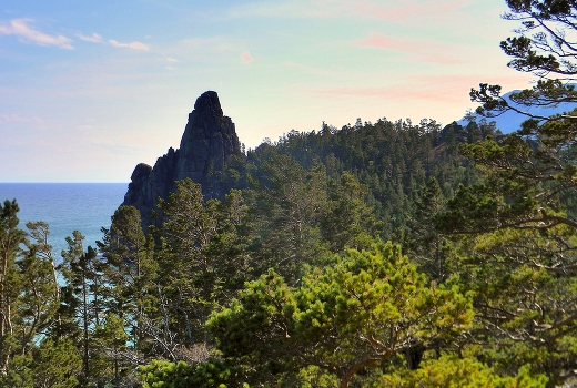 Вид с утеса Большая Колокольня на утес Малая Колокольня, между которыми расположилась уникальная бухта Песчаная озера Байкал. В этой бухте вода летом самая теплая на озере.